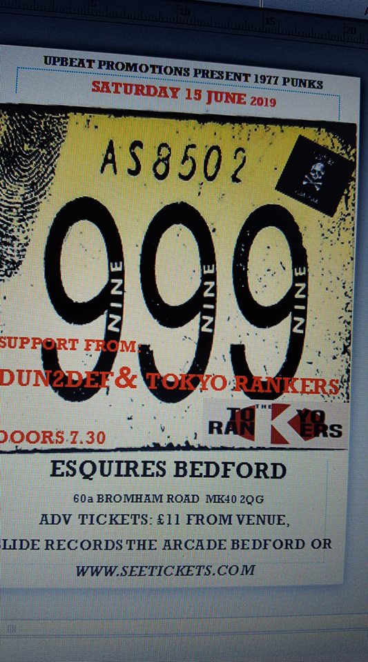 Punk veterans 999 return to Bedford Esquires, with Strong support from Dun 2 Def and Tokyo Rankers
