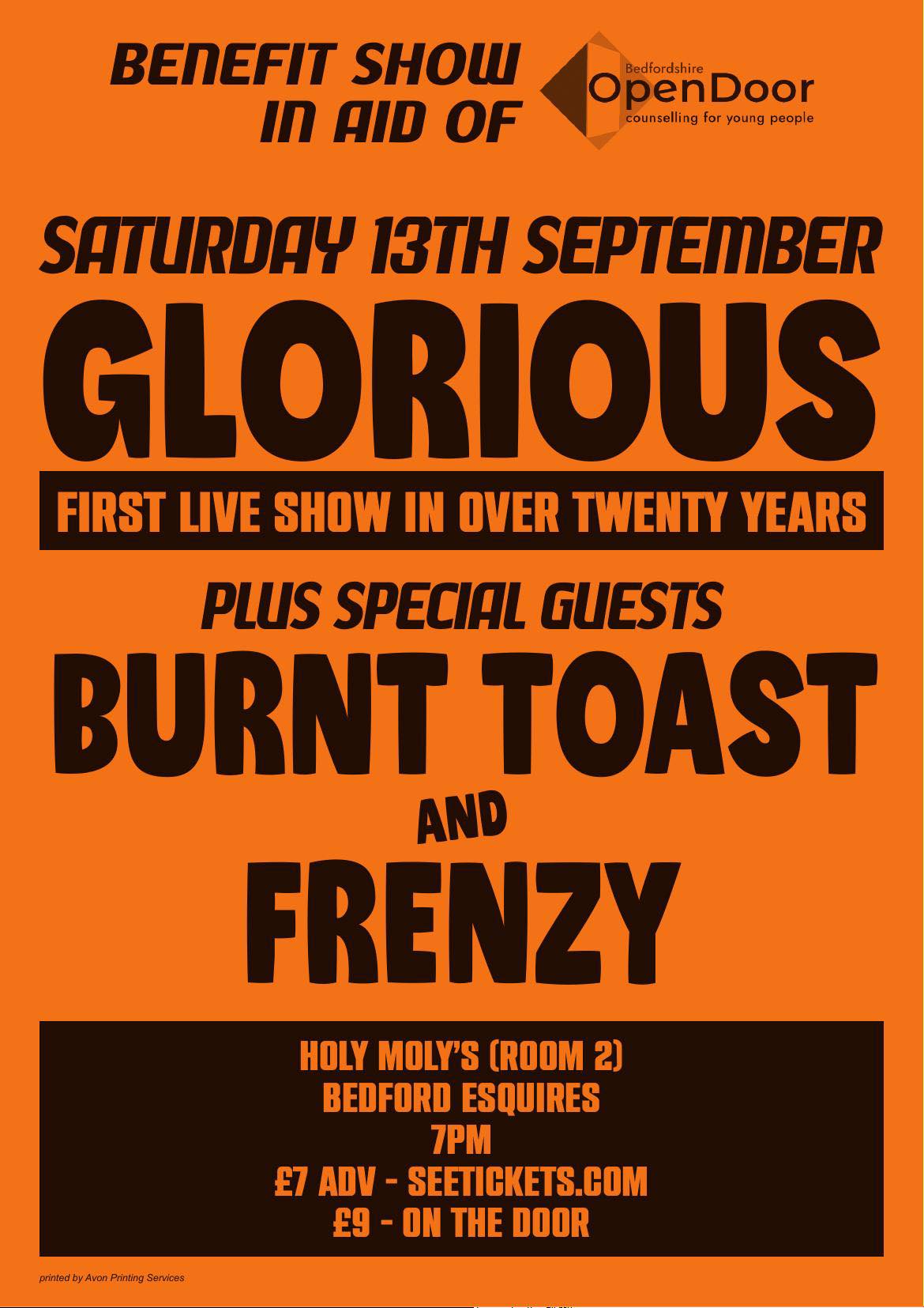 I’m pleased to announce, that GLORIOUS will be playing a one off show, on September 13th, in Holy Moly’s (Room 2) at Bedford Esquires.