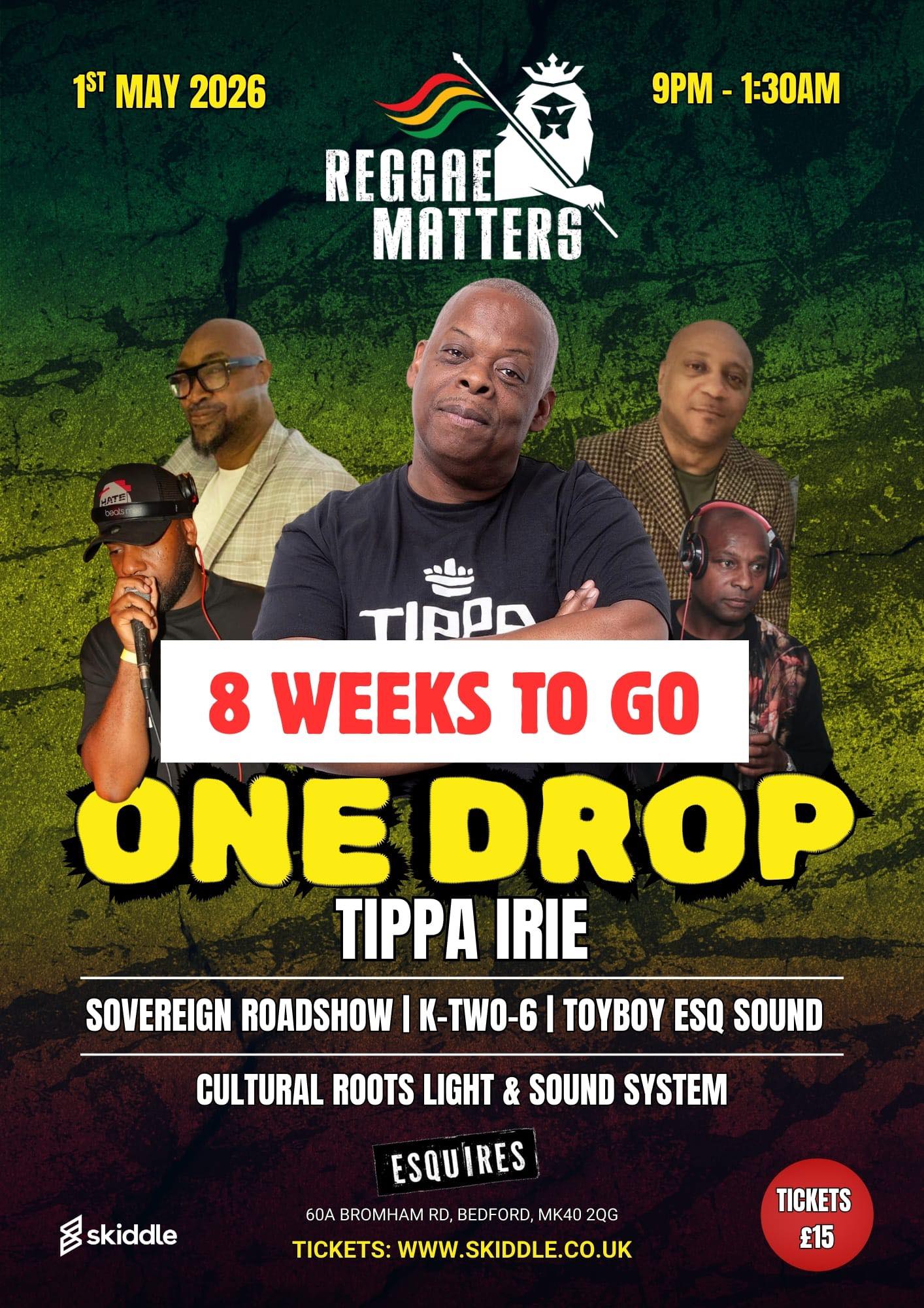 On Friday 1st of May 2026, Reggae Matters Presents - One Drop Join us for a night of Reggae & Old School Dancehall at Bedford Esquires! Featuring Sovereign Roadshow, Toy Boy Esq, K-Two-6, and a live performance by legendary MC …