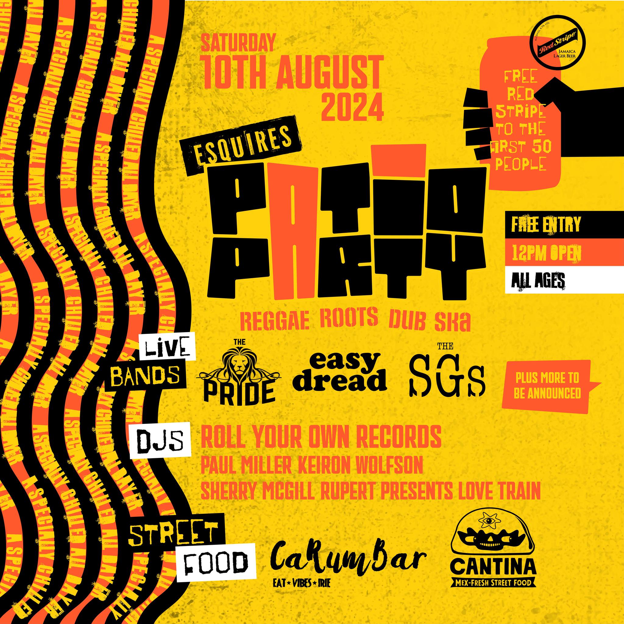 Yep, actual free beer. Esquires brewery, Marstons have kindly given us 50 free pints of Red Stripe to give away to the first 50 people through the gates (1pp).