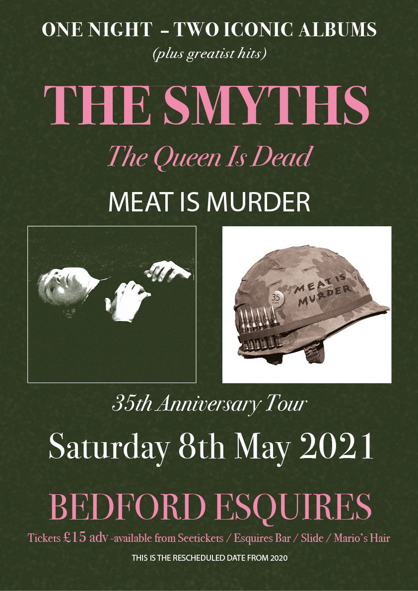 Tickets are £15 in advance. Available now from https://www.seetickets.com/event/the-smyths-perform-meat-is-murder-/bedford-esquires-bedford/1470525 and from Esquires Bar, Slide Record Store and Mario’s Hair Design (Kempston) with no booking fees.