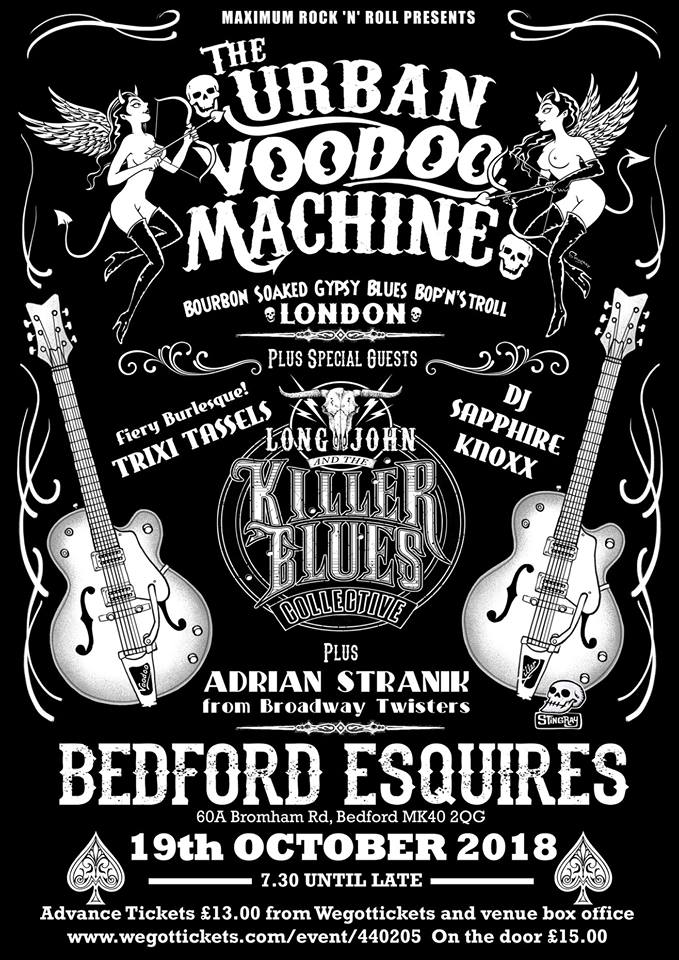 Described as Bourbon Soaked Gypsy Blues Bop’n’Stroll, The Urban Voodoo Machine are a murderers’ row of rogues dressed in black and red, led by the ever enigmatic Paul-Ronney Angel, who spend their time exploring Gypsy Blues, Americana, New Orleans Jazz, Rock’n’Roll and the wares of Mr Jack Daniels. With comparisons to The Pogues and Tom Waits, The Urban Voodoo Machine are considered one of the most impressive live acts in the country – a claim supported by Classic Rock. Despite their influences, Angel insists that “we’re not Americana and we’re definitely not retro… I write songs about living in London right now. Although having a s**t time, no money, heartbreak, mental illness, addiction and suppression from ‘the big guy’ is kinda universal and timeless.”