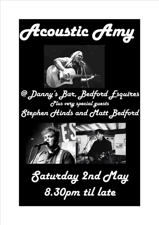 Acoustic Amy brings her covers set back to Danny’s bar at Bedford Esquires. Join us for a sing-along, and of course a few jars… support from Stephen Hinds and Matt Bedford… the friendliest line-up in Bedford 😀