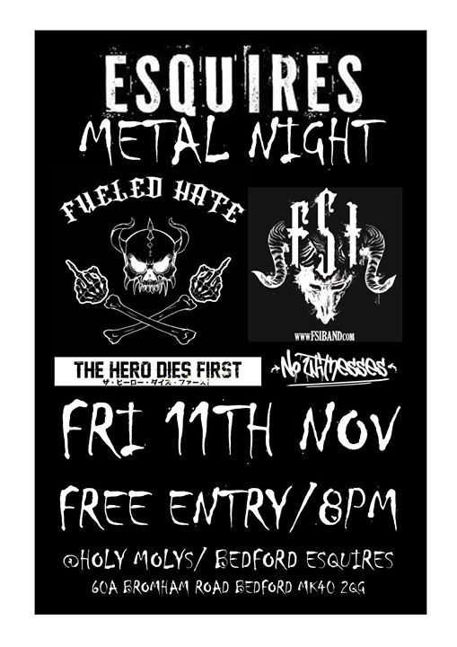 It’s METAL NIGHT, with Esquires favourites (rap infused metal band hailing from Corby) Fueled Hate. Support comes from F.S.I, THE HERO DIES FIRST and newcomers No Witnesses